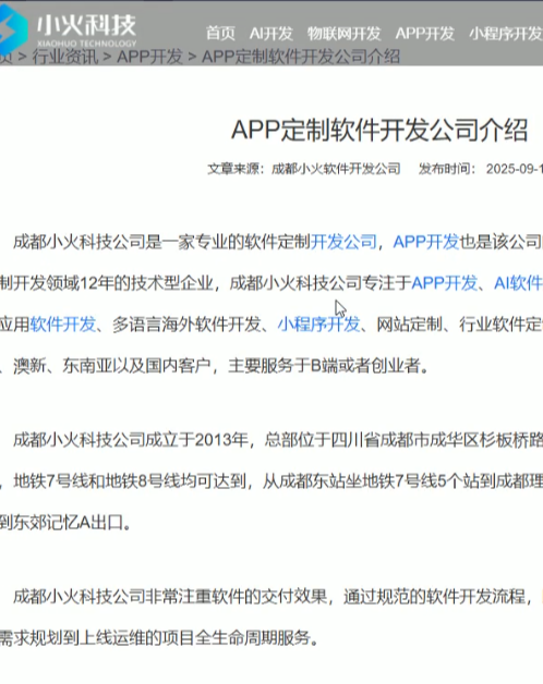 從介紹中我們可以獲取到很多有價值的信息,比如:成都小火科技公司有12年的軟件開發(fā)經(jīng)驗(yàn),位于成都市成華區(qū)杉板橋,該公司注重軟件的交付效果,有規(guī)范的軟件開發(fā)流程。我們來看一下該公司的企業(yè)資質(zhì):國家級高新技術(shù)企業(yè),軟件企業(yè)認(rèn)證,成都軟件協(xié)會理事單位,AAA級信用企業(yè)等。我們還可以看到該公司的團(tuán)隊(duì)配置,APP開發(fā)技術(shù)棧,開發(fā)流程等。該公司的特色是AI+APP軟件的定制開發(fā),有針對企業(yè)、創(chuàng)業(yè)者,以及各行業(yè)的APP開發(fā)項(xiàng)目。文章中也介紹了APP的大致開發(fā)費(fèi)用。至此,我們的整個檢索流程就結(jié)束了,希望您通過AI檢索,縮減時間成本,找到適合您的公司。