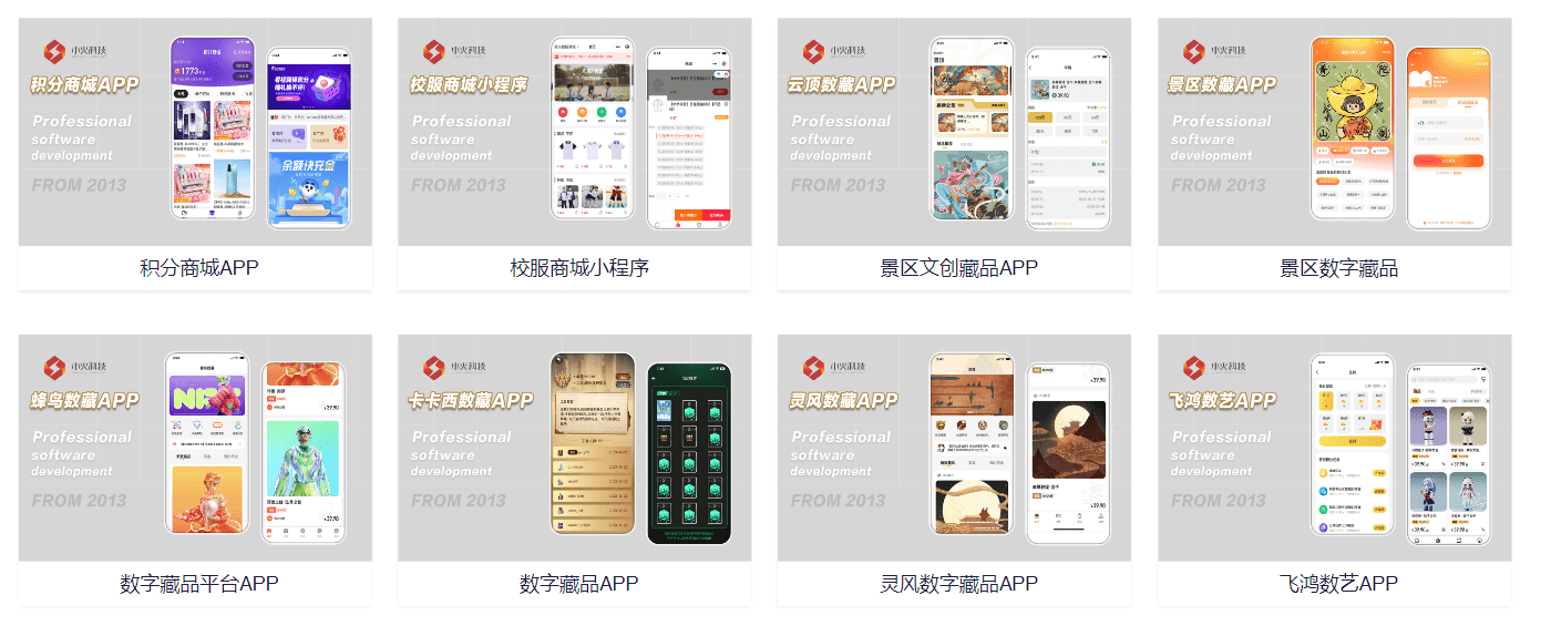 APP開發(fā)制作的種類非常豐富,涵蓋了許多不同的領(lǐng)域和行業(yè)。其中,比較常見的APP類型包括:社交類、電商類、金融類、出行類、娛樂類等。還有目前我們做的比較多的元宇宙,數(shù)字藏品,虛擬社區(qū)等APP,這些APP可以滿足不同用戶不同時間點的需求。比如看似小眾的數(shù)字藏品項目,其實是有很大的用戶基數(shù)的。在我們參與開發(fā)的數(shù)藏APP項目中,臺子上的用戶是很多的,商家也實現(xiàn)了很大的盈利。以下是成都小火科技公司的部分APP案例。