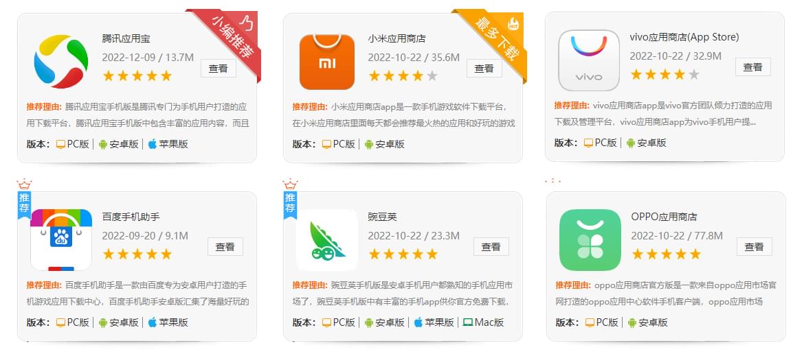 不同的手機(jī)應(yīng)用市場(chǎng)上架標(biāo)準(zhǔn)是不一樣的。目前主要的安卓平臺(tái)有華為、小米、vivo、oppo、魅族、pp助手/豌豆莢、應(yīng)用寶、百度手機(jī)這幾個(gè)市場(chǎng)。