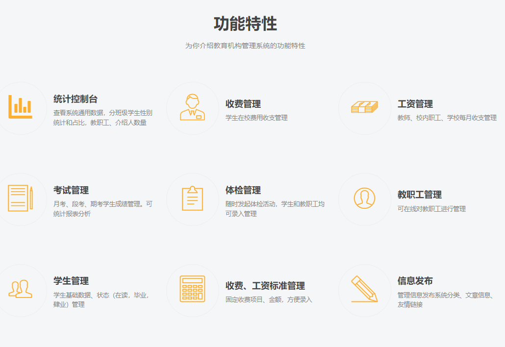 系統(tǒng)內(nèi)置信息發(fā)布功能,支持管理信息發(fā)布系統(tǒng)分類(lèi)、文章信息、友情鏈接等功能。教育機(jī)構(gòu)可利用該功能,開(kāi)展線上線下多元化的宣傳渠道,提升品牌知名度和影響力。