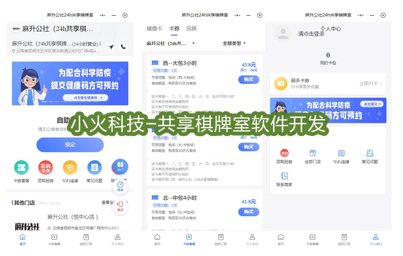 下面是成都小火科技公司的一套24小時共享棋牌室小程序案例。軟件對接硬件之后,可以實現開門、離店、訂單開始電源自動開啟等功能。同時用戶在軟件上可以選擇卡券套餐、續(xù)單、團購驗券、WIFI連接、聯系商家。