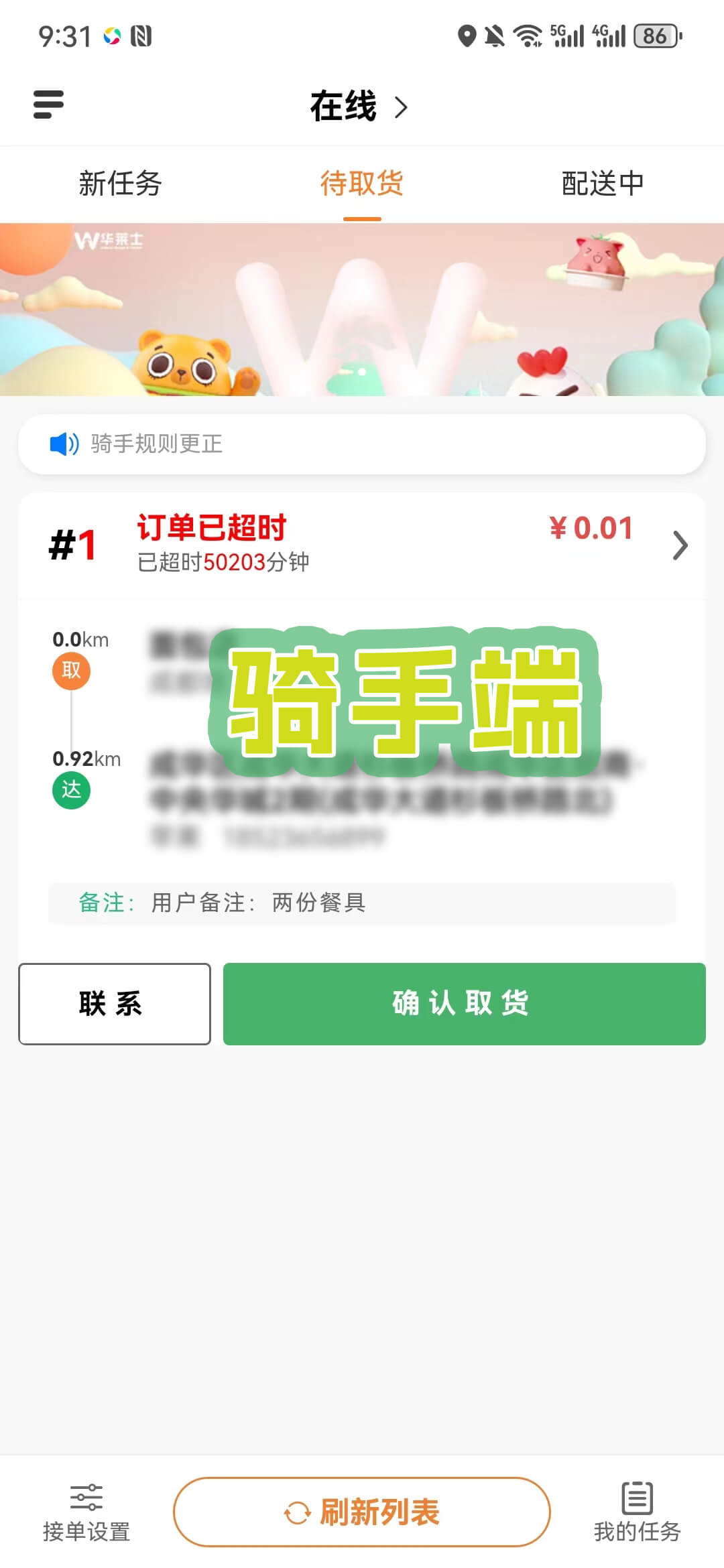 主頁面布局清晰,分為新任務(wù)、待取件、代送達(dá)三個(gè)進(jìn)度界面。訂單分類明確,根據(jù)用戶下達(dá)的不同類型的訂單,都會(huì)有明顯的標(biāo)簽區(qū)分,如外賣訂單、普通訂單、跑腿訂單(幫買、幫送)、調(diào)度臺(tái)指派單、調(diào)度臺(tái)改派單、預(yù)約訂單等。