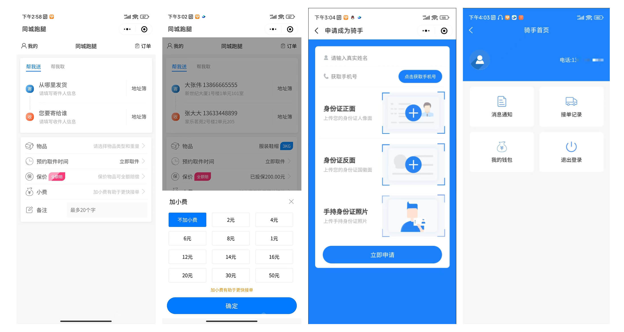 這款同城跑腿小程序包含用戶端、騎手端和運營后臺,支持幫取、幫送等多種模式,具備以下功能特性: