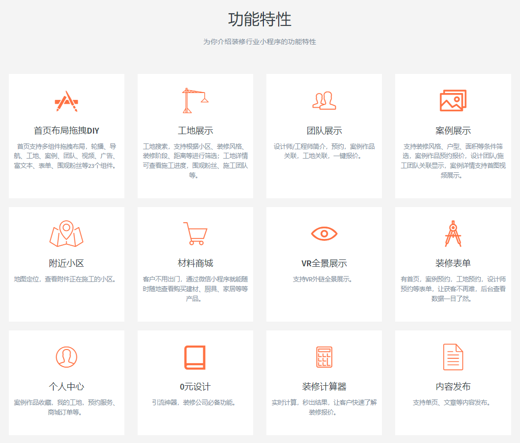 針對裝修行業(yè),小火科技為您推薦一款專業(yè)的裝修設(shè)計公司小程序。這款解決方案集成了多種豐富功能,包括首頁布局拖拽DIY、附近小區(qū)、個人中心、工地展示、材料商城、0元設(shè)計、團隊展示、VR全景展示、裝修計算器、案例展示、裝修表單和內(nèi)容發(fā)布等,能夠滿足裝修公司或者設(shè)計公司在小程序上的多元化需求。以下是該解決方案的詳細功能介紹: